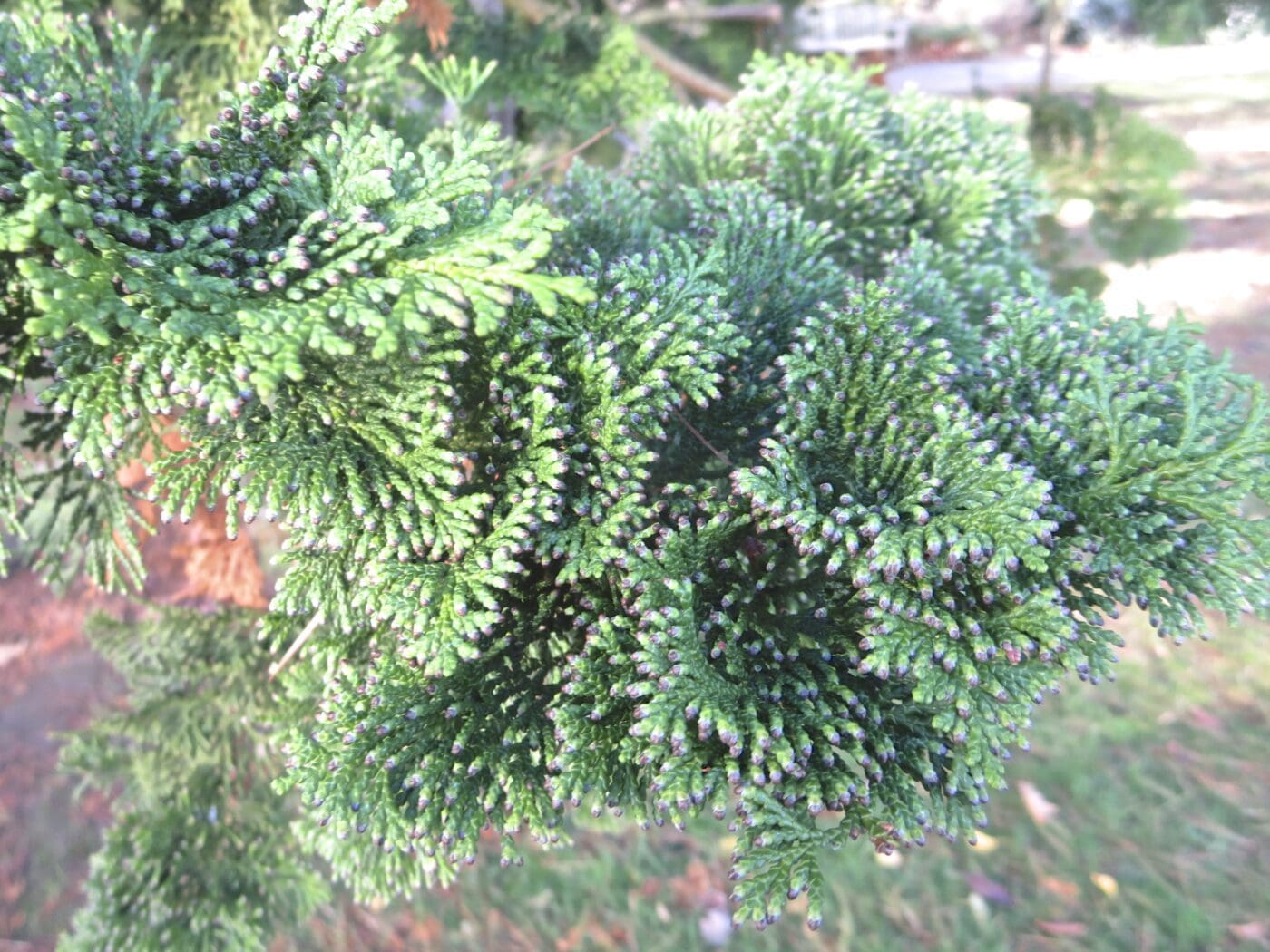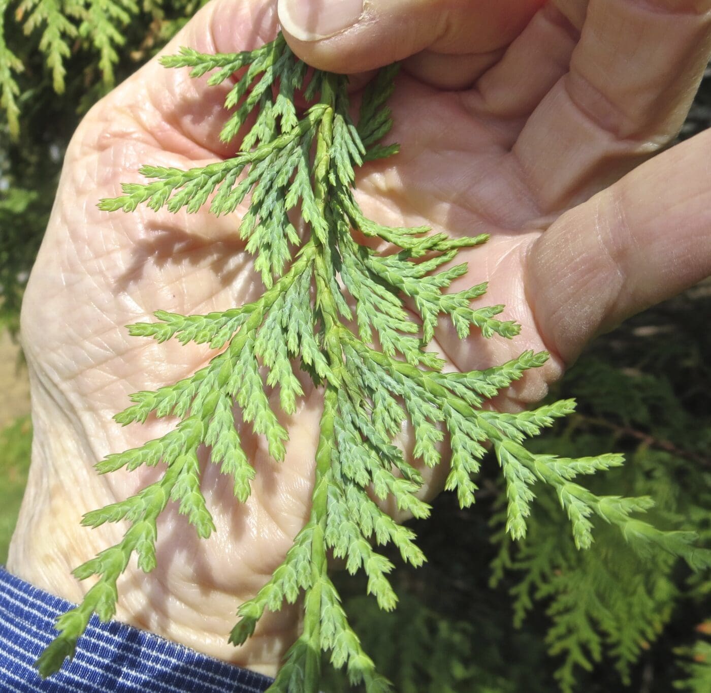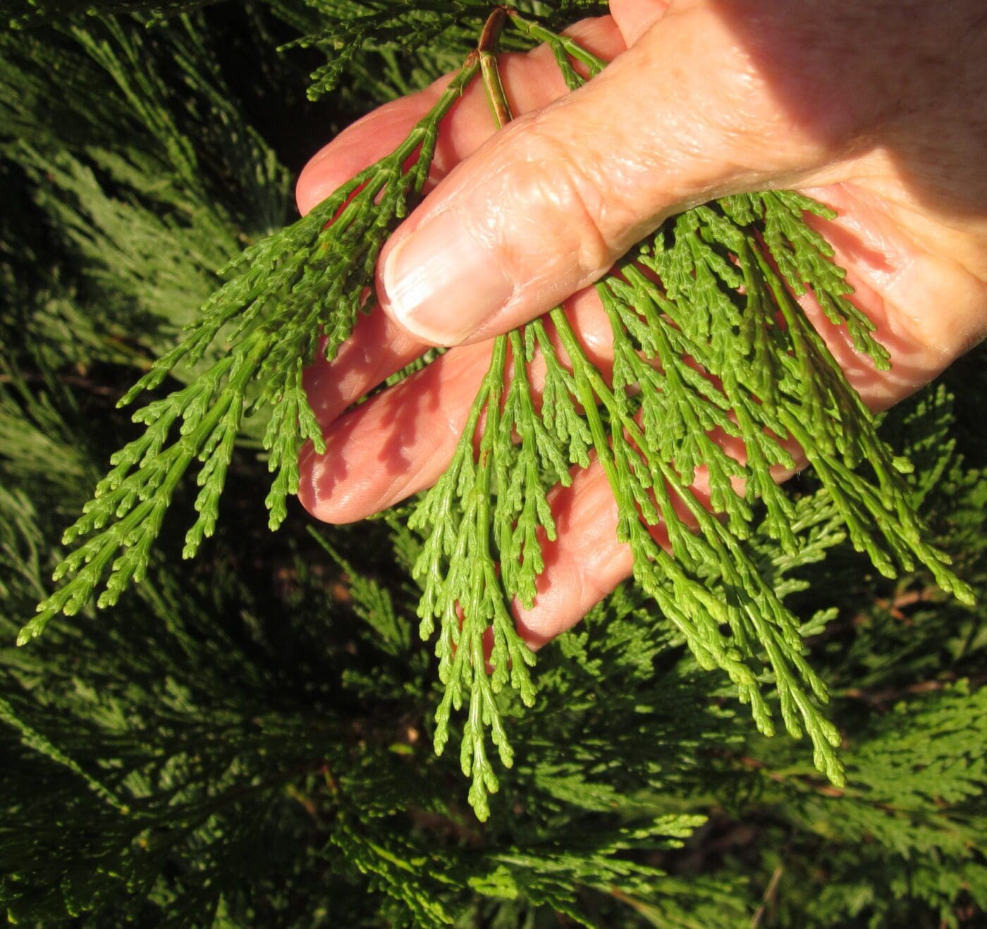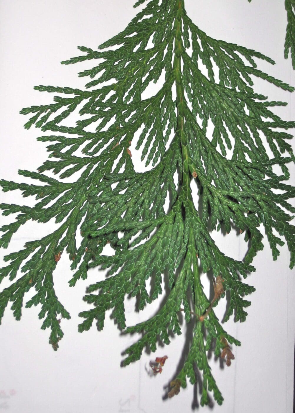 These conifer trees have scale-like leaves in flat sprays like a fern. They include four false cypress trees (in the genus Chamaecyparis) – Lawson Cypress, Nootka Cypress, Sawara Cypress and Hinoki Cypress, two false cedars – Western Red Cedar and Incense Cedar and the unique Oriental Thuja. These trees are best identified by examining the shape of the spray, the underside of the leaves and their cones.