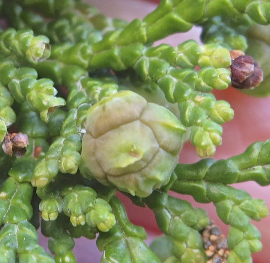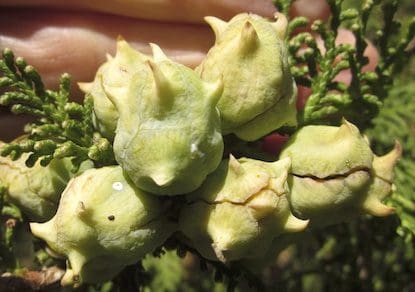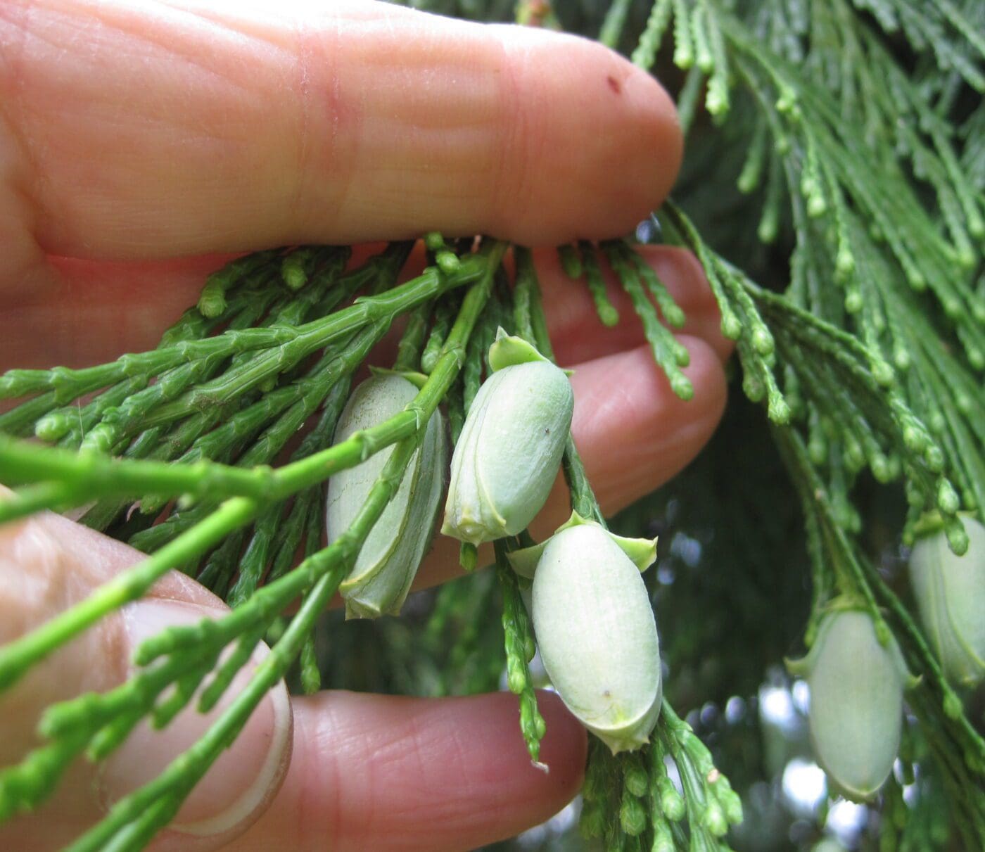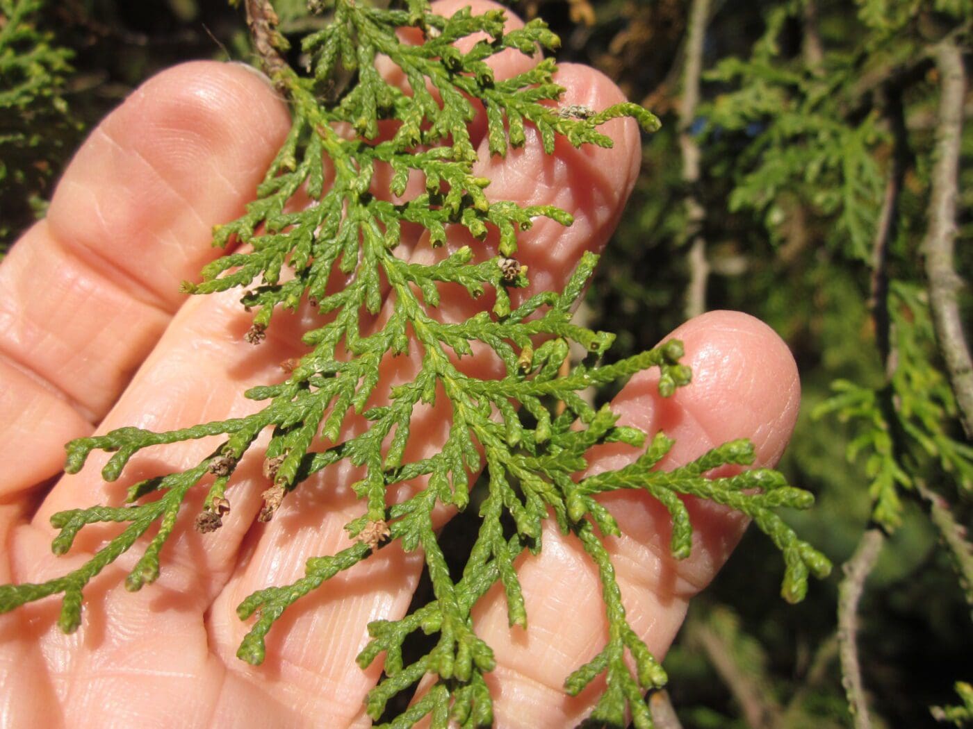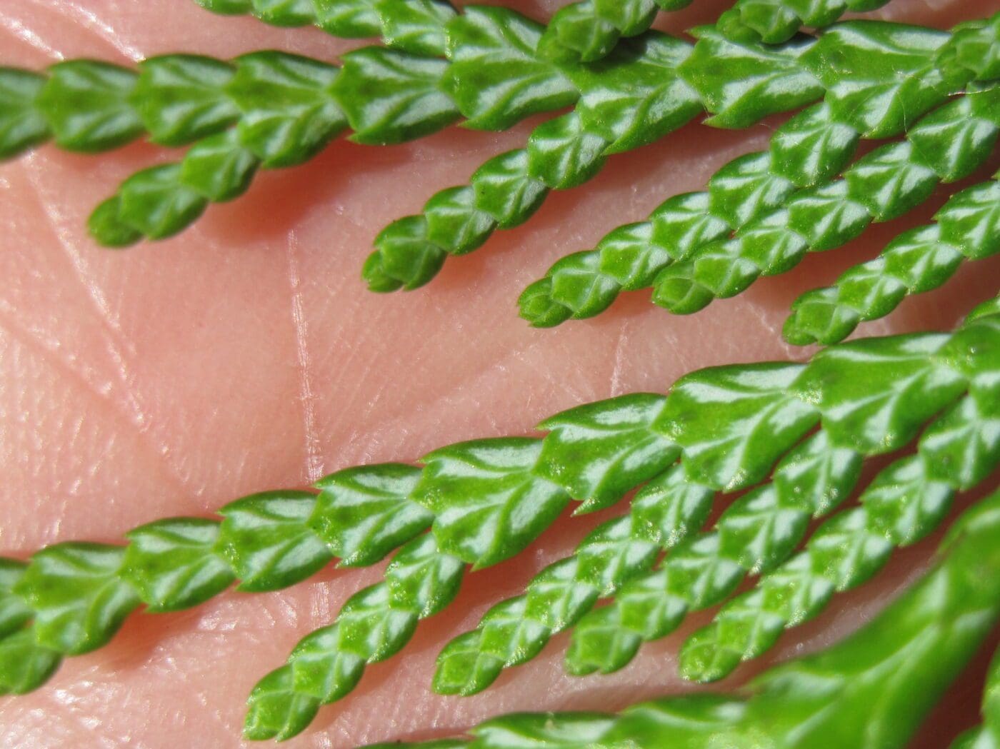 These conifer trees have scale-like leaves in flat sprays like a fern. They include four false cypress trees (in the genus Chamaecyparis) – Lawson Cypress, Nootka Cypress, Sawara Cypress and Hinoki Cypress, two false cedars – Western Red Cedar and Incense Cedar and the unique Oriental Thuja. These trees are best identified by examining the shape of the spray, the underside of the leaves and their cones.